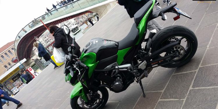 L’ambientazione in Mestre ha concesso al tester-driver di armonizzare gli spiriti ampiamente descritti e lo stile sugomi, affrontando ampie e ridotte rotonde, traffico cittadino ed autostradale, raggiungendo mestrini elementi architettonici ed edifici di moderna concezione per scuotere l’emotiva tecnologia motoristica e il coraggioso design di edifici nati per vincere: eccellenza contro appiattimento, coraggio architettonico e design innovativo contro ogni proposta di scontata aspettativa commerciale. Kawasaki Z900 meritava ancor più soddisfazione, una sfida maggiore per osare dove altre eccelse concorrenti non hanno osato: conquistare Venezia, le sue calli, l’inimitabile ambiente acqueo e, soprattutto, sfidare l’esaltazione mistica d’un esemplare architettonico noto al mondo: il ponte di Calatrava. Non v’era turista o veneziano che non torcesse l’occhio verso la Z900, nonostante le circostanti bellezze: la Z900 risultava un diamante unico, anche spinta a mano tra minacciose zebre pedonali per avvicinarsi a Ponte di Calatrava; molti la circondavano durante il passo ed a cavalletto posizionato con dolcezza sul terreno, apprezzando doti e dettagli della Z900 in lingue differenti; un reverente e spontaneo allontanamento della folla ha dato sfogo all’esultanza per uno scatto che immortalasse l’armoniosa convivenza tra la verde Kawasaki Z900 e il ponte di Calatrava.