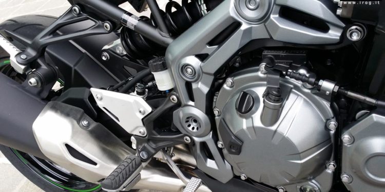 Euro 4, telaio composto essenzialmente da componenti leggeri e peso di 210 kg. Il telaio a traliccio e forcellone leggeri risultano fondamentali per ottenere l’elevata maneggevolezza della Kawasaki Z900; il peso ridotto e la sella bassa (795 mm) contribuiscono alla manovrabilità e consentono al pilota di poggiare agevolmente i piedi a terra, mentre l’ampia angolazione dello sterzo facilita ulteriormente le manovre a bassa velocità o nelle rotonde cittadine.