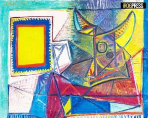 Si tratta di Natura morta con testa di toro, un olio su tela, dipinto dal genio spagnolo nel 1942. L’opera è stata eseguita in un momento tragico dell’esistenza di Picasso – per via della guerra e di lutti personali – e va intesa come l’introduzione di un preciso motivo iconografico, da leggersi come un memento mori. Nell’insieme la potenza espressiva e la qualità del dipinto sono altissime: si tratta di un’opera fondamentale per rileggere la serie delle teste di toro e la produzione di Picasso negli anni della guerra.