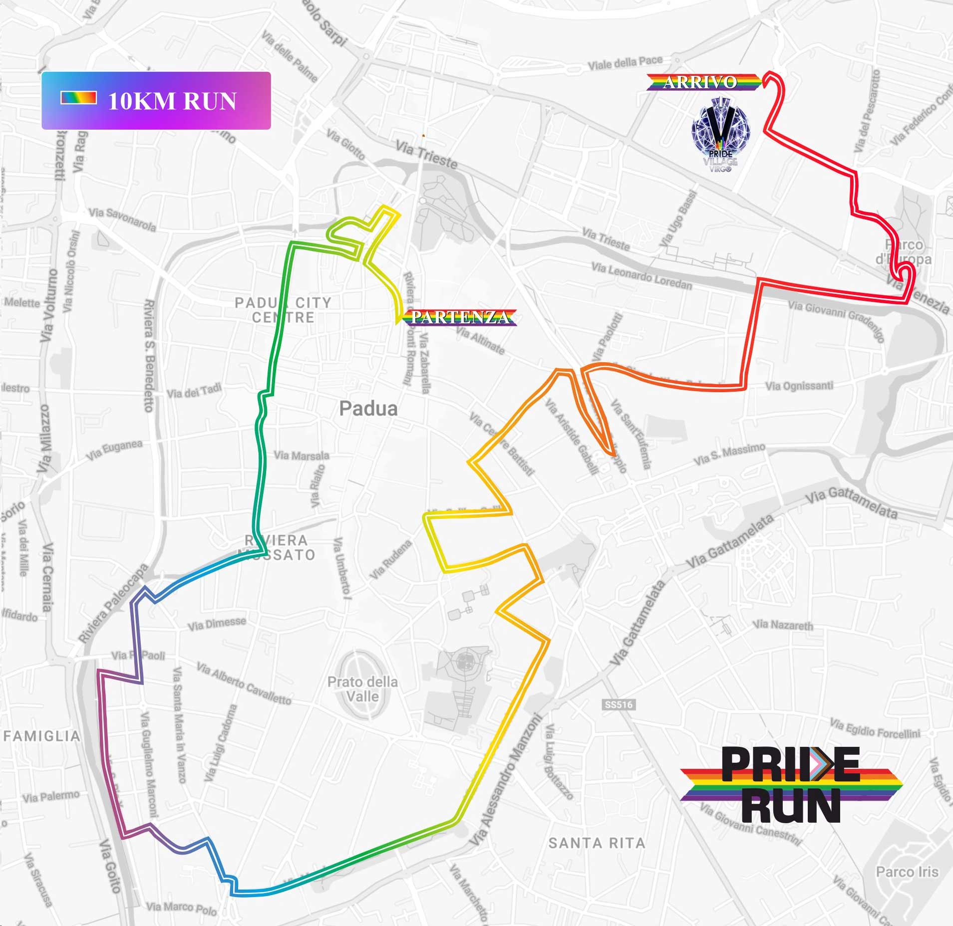 Il punto di partenza sarà per tutti coloro che vorranno partecipare, correndo o anche solo camminando, Piazza Garibaldi alle ore 18.00. Da lì si snoderà un percorso unico di 10 km, per le vie di Padova, coinvolgendo anche il Park Contarine, museo padovano della street art, che vedrà il passaggio dei runner provenienti da via Matteotti, che usciranno poi in Riviera Mugnai per convergere verso Piazza Duomo attraverso via Dante. Da lì si punterà a Riviera San Benedetto e Riviera Paleocapa, arrivando in Piazzale Santa Croce, attraverso via S. Alberto Magno, via Marconi, via Colombo, via S. Pio X, via Albania via Cappuccini e via Santa Maria in Vanzo. Da Vicolo Santorini, dove si troverà il punto ristoro. Da lì si ritornerà verso il centro: Pontecorvo, via S. Francesco, via Cesarotti, via del Santo e via San Francesco, via Santa Sofia e via Altinate. La corsa proseguirà verso la zona ospedali (via Falloppio) e, passando per via Belzoni, arriverà al Portello per imboccare il lungargine del Piovego.. Una volta attraversato Parco Europa attraverso via del Pescarotto, via Murialdo e via Rismondo, si arriverà al Pride Village Virgo.