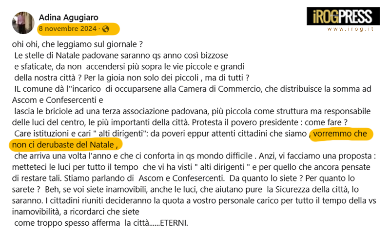 La diffida alla Agugiaro è stata inviata, secondo lo studio legale, per avere denigrato la CCIAA di Padova a mezzo social network ed in merito a una pubblicazione definita la “volgarità dell’allusione” avendo ella scritto di non volere essere “derubati del Natale”. Parte del post incriminato, riportante il presunto furto del Natale, cita “Il comune dà l’incarico di occuparsene alla Camera di Commercio, che distribuisce la somma ad Ascom e Confesercenti e lascia le briciole ad una terza associazione padovana, più piccola come struttura ma responsabile delle luci del centro, le più importanti della città. Protesta il povero presidente: come fare? Care istituzioni e cari ‘alti dirigenti’: da poveri eppur attenti cittadini che siamo, vorremmo che non ci derubaste del Natale.”