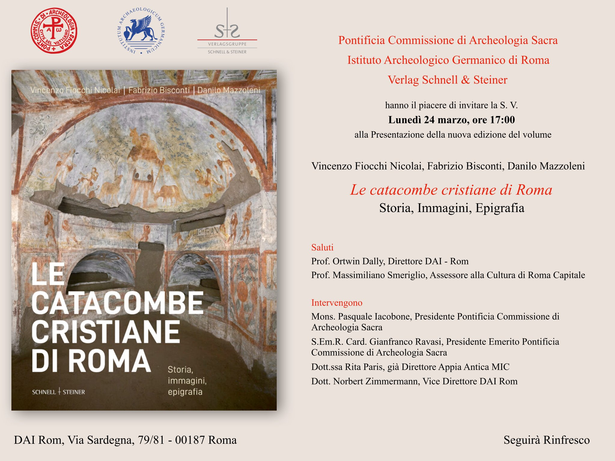 Dopo i saluti inaugurali del Prof. Ortwin Dally, Direttore dell’Istituto Archeologico Germanico, e del Prof. Massimiliano Smeriglio, Assessore alla Cultura di Roma Capitale, interverranno Mons. Pasquale Iacobone, Presidente della Pontificia Commissione di Archeologia Sacra, Sua Eminenza il Cardinale Gianfranco Ravasi, Presidente Emerito della Pontificia Commissione di Archeologia Sacra, la Dott.ssa Rita Paris, già Direttore Appia Antica MIC, e il Dott. Norbert Zimmermann, Vice Direttore dell’Istituto Archeologico Germanico.