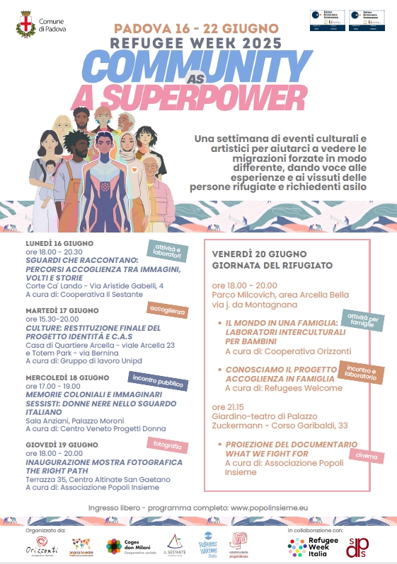 La Refugee Week 2025 è promossa dal SAI, Sistema Accoglienza Integrazione del Comune di Padova e organizzata dalle realtà della sua rete locale: Cooperativa Orizzonti, Associazione Popoli Insieme, Cooperativa sociale Coges don Milani, Cooperativa sociale Il Sestante, Refugees Welcome Italia e Centro Veneto Progetti Donna. Inoltre il progetto vede la collaborazione del Dipartimento di Psicologia dello Sviluppo e della Socializzazione dell’Università di Padova.