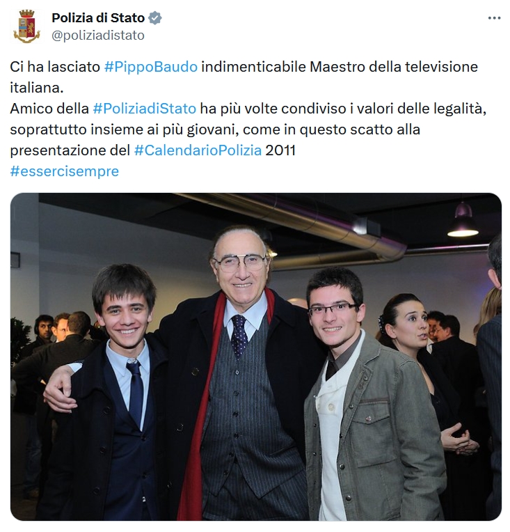 “Ci ha lasciato Pippo Baudo indimenticabile Maestro della televisione italiana. Amico della Polizia di Stato ha più volte condiviso i valori delle legalità, soprattutto insieme ai più giovani, come in questo scatto alla presentazione del Calendario Polizia 2011”, così è ricordato dalla Polizia di Stato.
