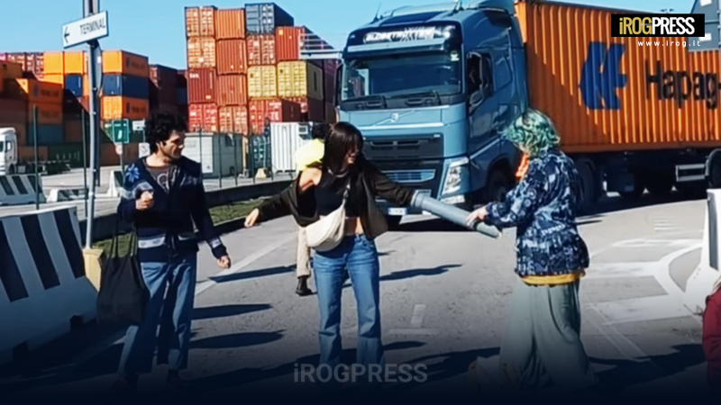 L’organizzazione ha denunciato un grave episodio di potenziale pericolo: “Uno dei camion presenti non si è fermato e ha proseguito verso i manifestanti incatenati che, impossibilitati a spostarsi, hanno quindi rischiato di essere investiti”. Al varco d’uscita, altri attivisti esponevano bandiere palestinesi e intonavano cori di sostegno a Gaza e alla Global Sumud Flotilla.