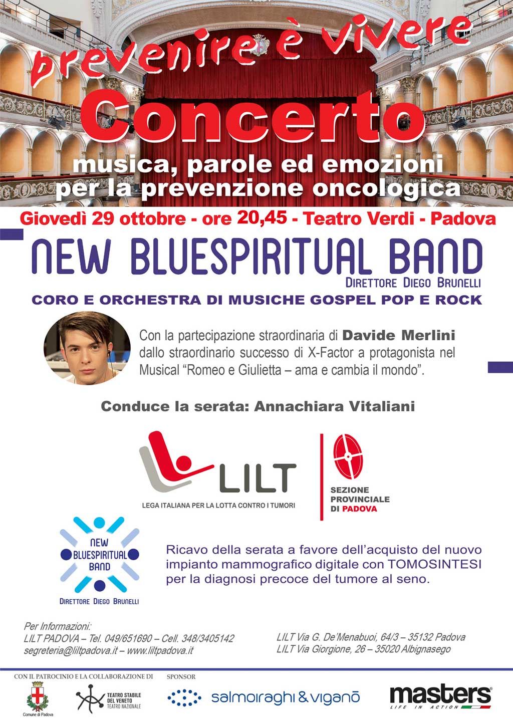 Il concerto si è tenuto la sera di ieri 29 ottobre, grazie alle performaces della New Bluespiritual Band, diretta dal Maestro Diego Brunelli, ed al contributo dello special guest Davide Merlini, terzo classificato a X-FACTOR 2012 e protagonista per due anni nelle vesti di Romeo nel musical “Romeo e Giulietta – ama e cambia il mondo”.
