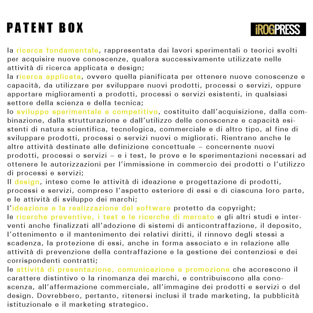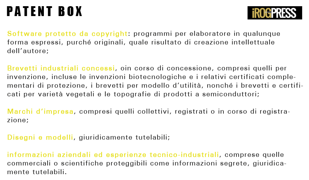 E’ evidente, quindi, che il Patent Box è applicabile a qualsiasi soggetto residente nel territorio dello Stato Italiano, senza particolare distinzione tra categoria di appartenenza, dimensione o gruppo produttivo: è necessario il diritto allo sfruttamento economico dei beni immateriali e che sia svolta attività di ricerca e sviluppo.