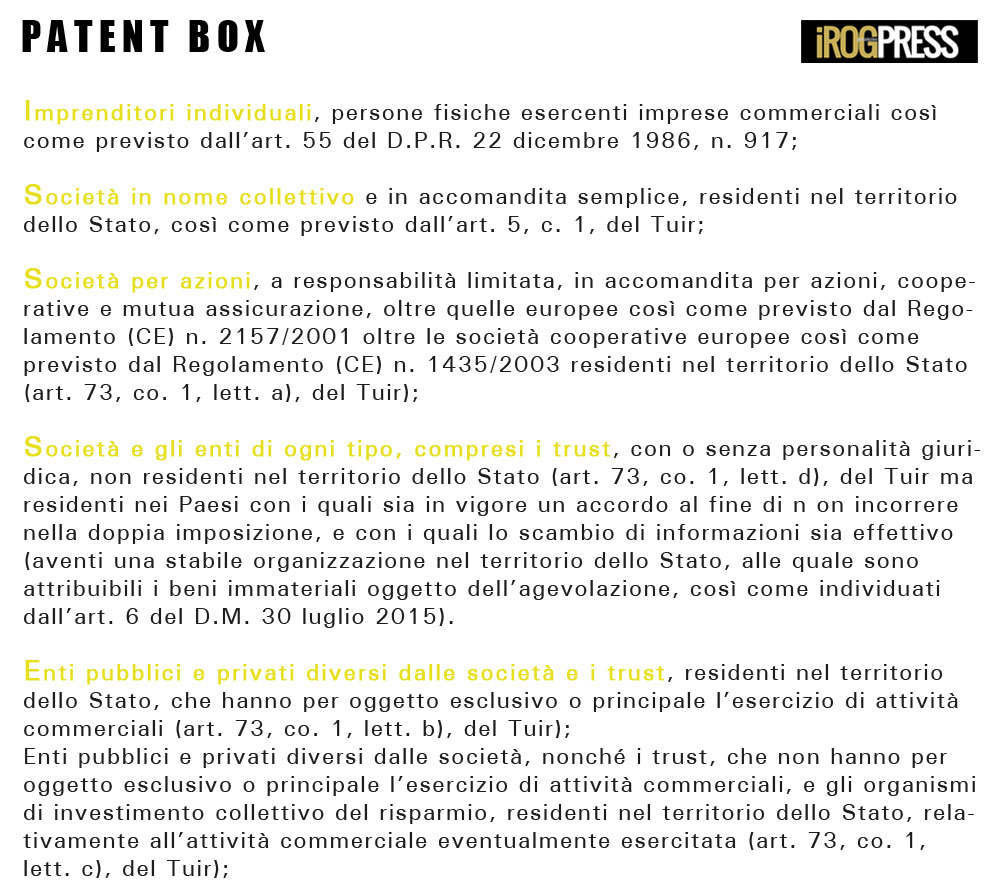 L’accesso alla cosiddetta agevolazione Patent Box è riconosciuta dall’art. 2 del D.M. 30 luglio 2015 ed è rivolta a tutti i soggetti esercenti attività di ricerca e sviluppo, aventi diritto allo sfruttamento economico dei beni immateriali (meglio indicati nell’art. 6) e titolari di reddito d’impresa, ovvero a: