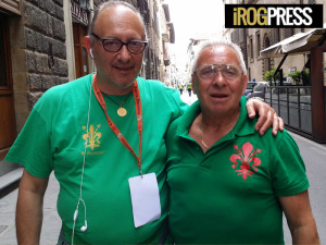 Quest’anno, prima dell’incontro e in un surreale svuotato limitrofo centro storico per motivi di sicurezza, abbiamo avuto accesso da Via dè Benci, intervistando esponenti storici dei calcianti Verdi di San Giovanni. Incontriamo per primo il verde e storico “Cucciolo” (a dx, nella foto che segue), che ci presenta cordialmente Massimo Volpi (a sx, nella foto che segue), da anni inossidabile tassello dello staff della squadra.