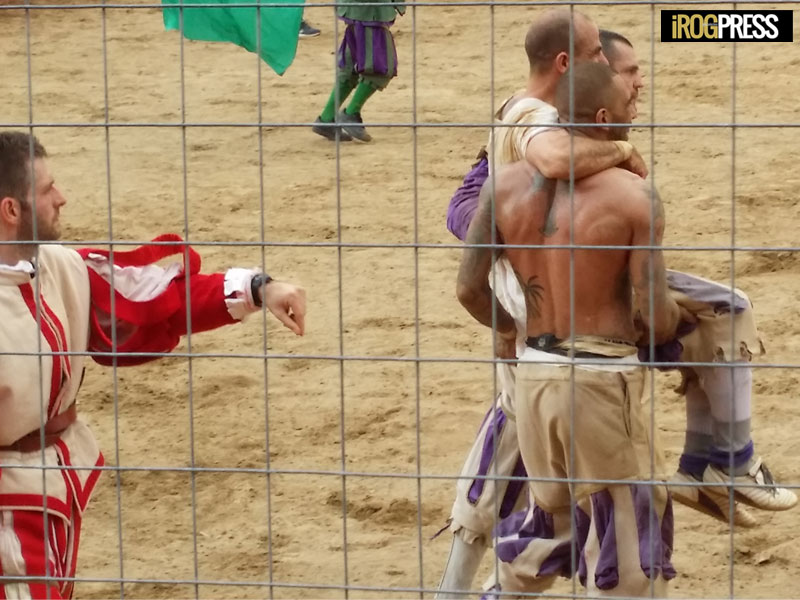 L’incontro si è svolto in costante equilibrio e parità di punteggio, fino al guizzo finale dei Bianchi: nel Sabbione, nonostante alcune espulsioni di calcianti e dubbiosi regolari atterramenti di corpi, volanti in stile lotta greco-romana, si è notato un estremo rispetto tra gli spalti avversari; qualche calciante “irritato” ha rischiato, però, di scatenare una rissa in campo tra centinaia di persone, ad incontro terminato. Astio da discutibile savoir-faire in campo? Non interessa: non v’è odio, spesso il rancore termina all’uscita dall’arena. Nessun brutto incidente. Oggi è stata l’occasione per ricordare Biagio Cingolani: un minuto di silenzio per il giovane calciante dei Rossi, mancato in gennaio per una malattia.