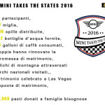 Storie di coppie, personali e famigliari hanno accompagnato il MTTS 2016. Chris e Lisa Chappell stavano organizzando il loro matrimonio e la luna di miele in crociera, solcando il mare d’Alaska: alla notizia di essere stati selezionati per partecipare al Tour, hanno cancellato la crociera e subito si sono uniti al MINI TAKES THE STATES 2016, descrivendolo come il ‘MINImoon‘ ovvero la loro luna di miele in MINI.