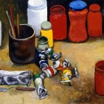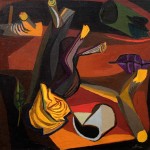 La carica travolgente delle nature morte di Guttuso è una caratteristica distintiva della sua pittura. L’esposizione propone alcuni capolavori che documentano, negli anni ‘40, con Natura con drappo rosso (1942, Olio su tela, 110×81 cm.) l’impegno dell’artista a testimoniare la drammatica condizione esistenziale, imposta dalla dittatura e dalla tragedia della guerra, cui si contrappone, come una bandiera, il grande panno, rosso squillante; nel dopoguerra, con Finestra (1947) o Bottiglia e barattolo (1948), il crescente interesse verso la sintesi postcubista picassiana, che rivela il profondo impegno dell’artista nel recupero della cultura artistica europea; per arrivare, negli anni sessanta, a una nuova fase della pittura guttusiana, che rivela una dimensione più meditativa, derivante anche dalla elaborazione, nei suoi scritti, dei temi del realismo e dell’informale, visibile ne Il Cestello (1959), La Ciotola (1960) e Natura morta con fornello elettrico (1961).