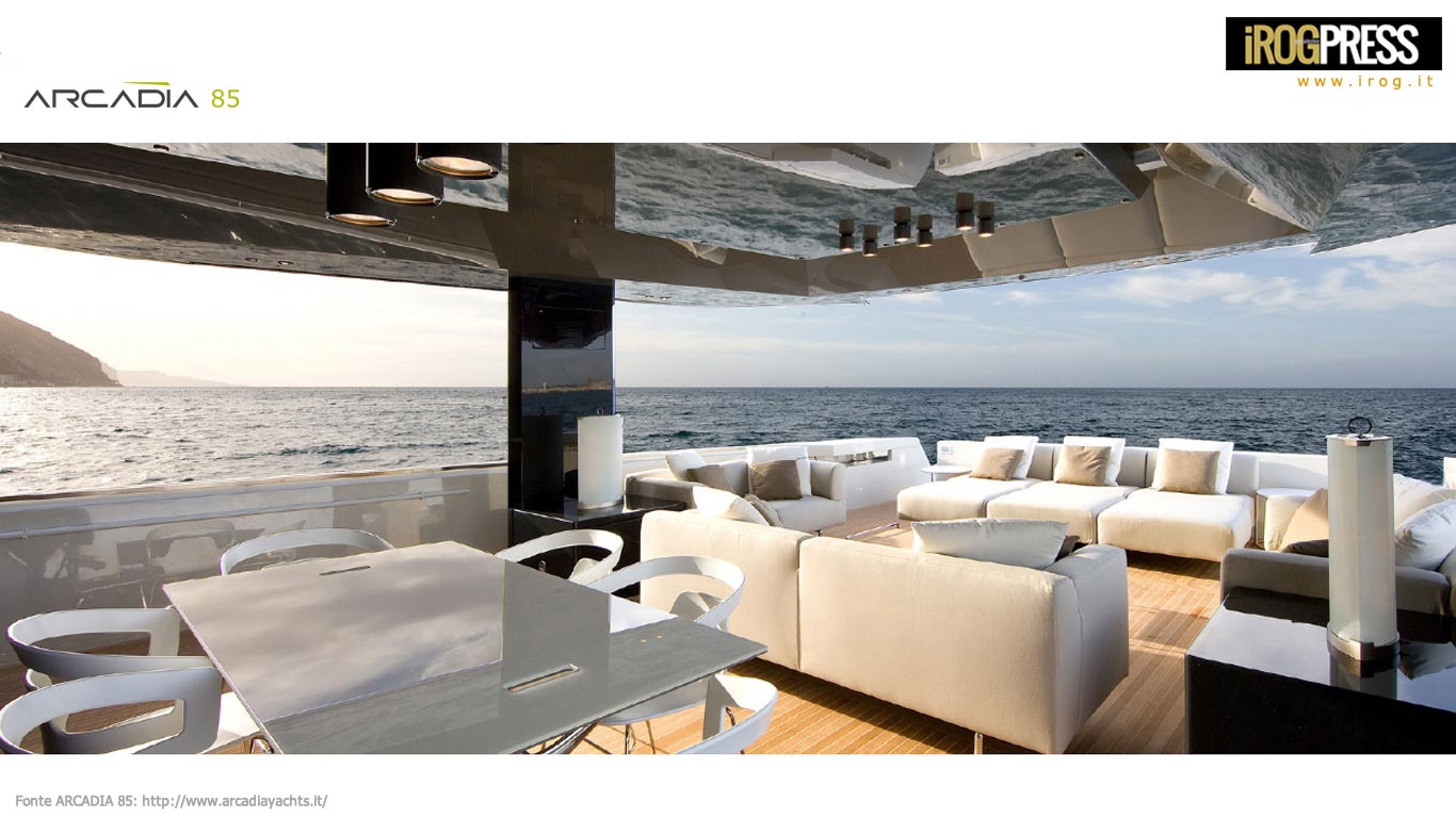 Il design dell’ARCADIA 85 riflette uno stile semplice e sobrio, con un mix armonioso tra le aree interne ed esterne. La deck-house è stata realizzata quasi interamente con un doppio strato vetro riflettente, dando agli interni un tocco luminoso e arioso. Gli oscuranti automatici del cielino e delle finestrature laterali offrono l’opportuna privacy – per proprietario e dai suoi ospiti, una volta giunti in porto o in una baia. L’imponente aft- deck lounge dell’ARCADIA 85 (circa 47sqm) dispone di un pozzetto ben protetto, ideale per cene, nonché un’ampia zona prendisole in direzione della poppa.