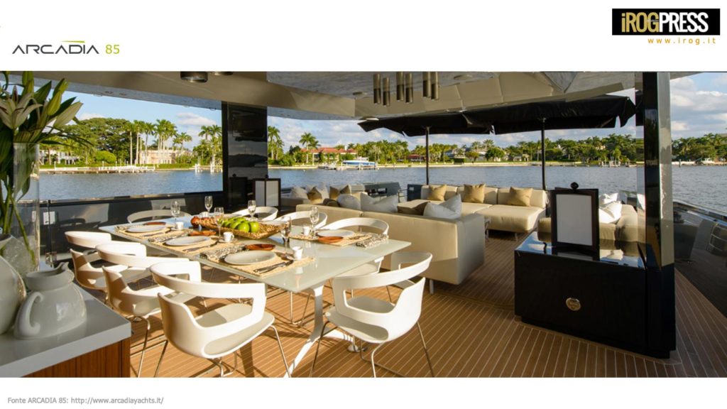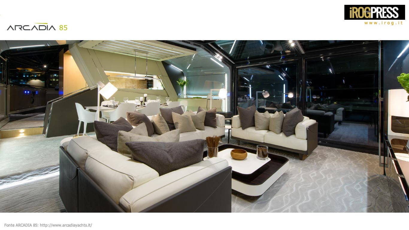 Il salone principale dell’ARCADIA 85 è grande oltre 32sqm ed è stato progettato per consentire una separazione tra internal lounge e la sala da pranzo. L’aft deck esterno (47sqm), offre una buona protezione dagli agenti esterni e insieme alla zona solarium (14,4 mq) a prua rafforza la possibilità per gli ospiti di trascorrere la maggior parte del tempo all’esterno in pieno contatto con la natura.