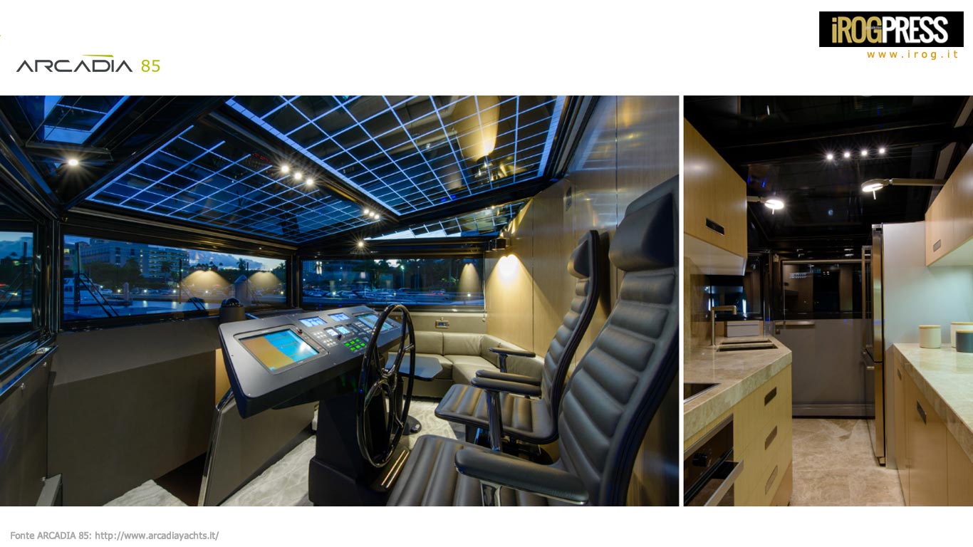 L’unicità del progetto Arcadia Yachts è da ricercare proprio nelle soluzioni di design, volte ad integrare i pannelli solari in un yacht semi-planante. La passione del cantiere per la tecnologia solare e l’eco-mobilità è finalmente espressa in uno yacht lungo 25.90mt e largo 7.15, dotato approssimativamente di 40 mq di pannelli fotovoltaici ciascuno dei quali è composto da centinaia di celle solari ad alte prestazioni. L’energia pulita prodotta attraverso questi pannelli ha una potenza massima di circa 4Kw. Ecco come e da dove ogni yacht Arcadia ottiene tutta l’energia necessaria per alimentare le strumentazioni di bordo quali frigoriferi, ice makers, sistemi audio e video, Tv etc. spegnendo i generatori quando in rada durante il giorno.