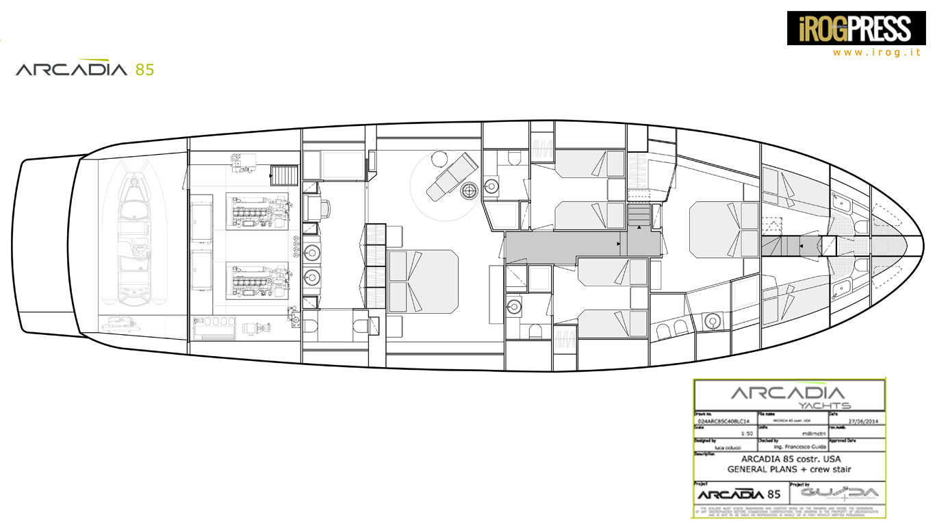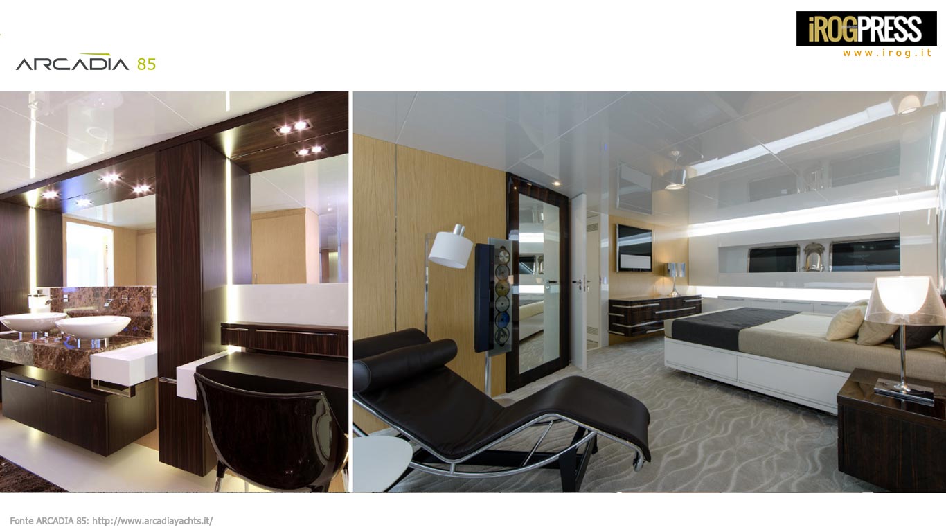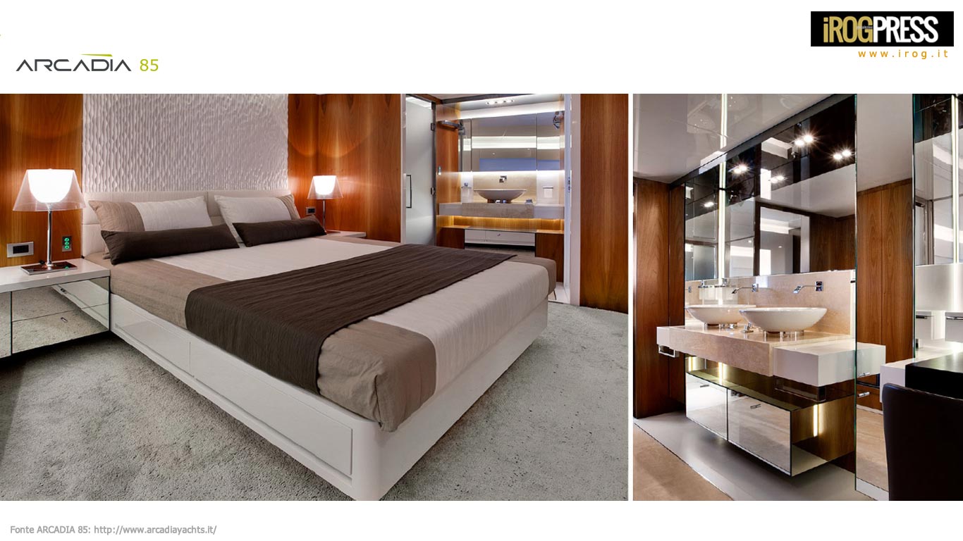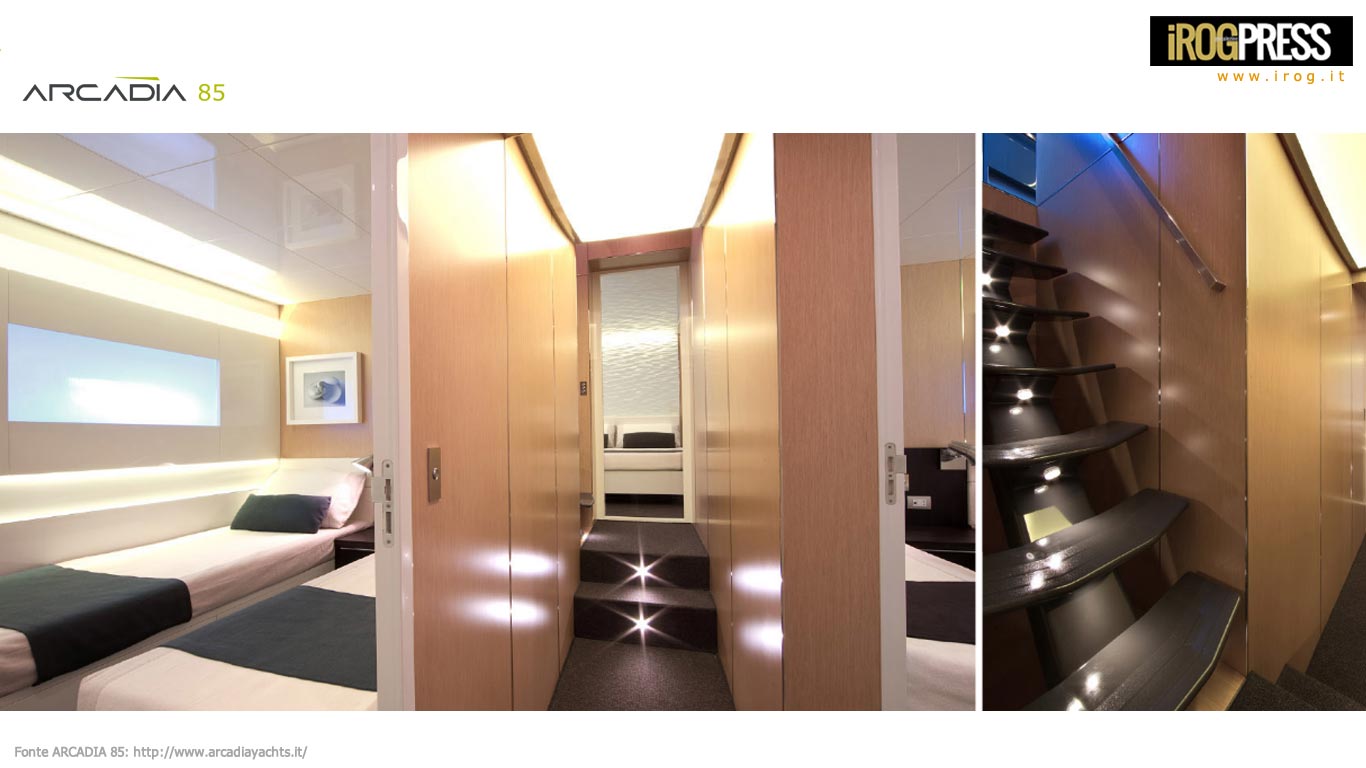 ARCADIA 85 è stato progettato come uno yacht per famiglie, che combina diverse funzionalità esterne in un unico deck, dando agli ospiti più possibilità di trascorrere del tempo insieme; mentre gli interni traggono giovamento dalla sensazione estetica di “ampio spazio aperto” e da un più stretto contatto con la natura, grazie alle finestre a scorrimento totale “dal pavimento al soffitto”. Questo yacht dispone di quattro cabine ospiti al ponte inferiore, tra cui la spettacolare cabina armatore di circa 32,5sqm. L’area è insolitamente grande, con una ineguagliabile area toilette. La grande cabina VIP a prua (15,5sqm) è dotata di letto matrimoniale e spogliatoio. Ci sono, infine, altre due cabine doppie ciascuno con un accesso riservata ad una toilette dedicata.