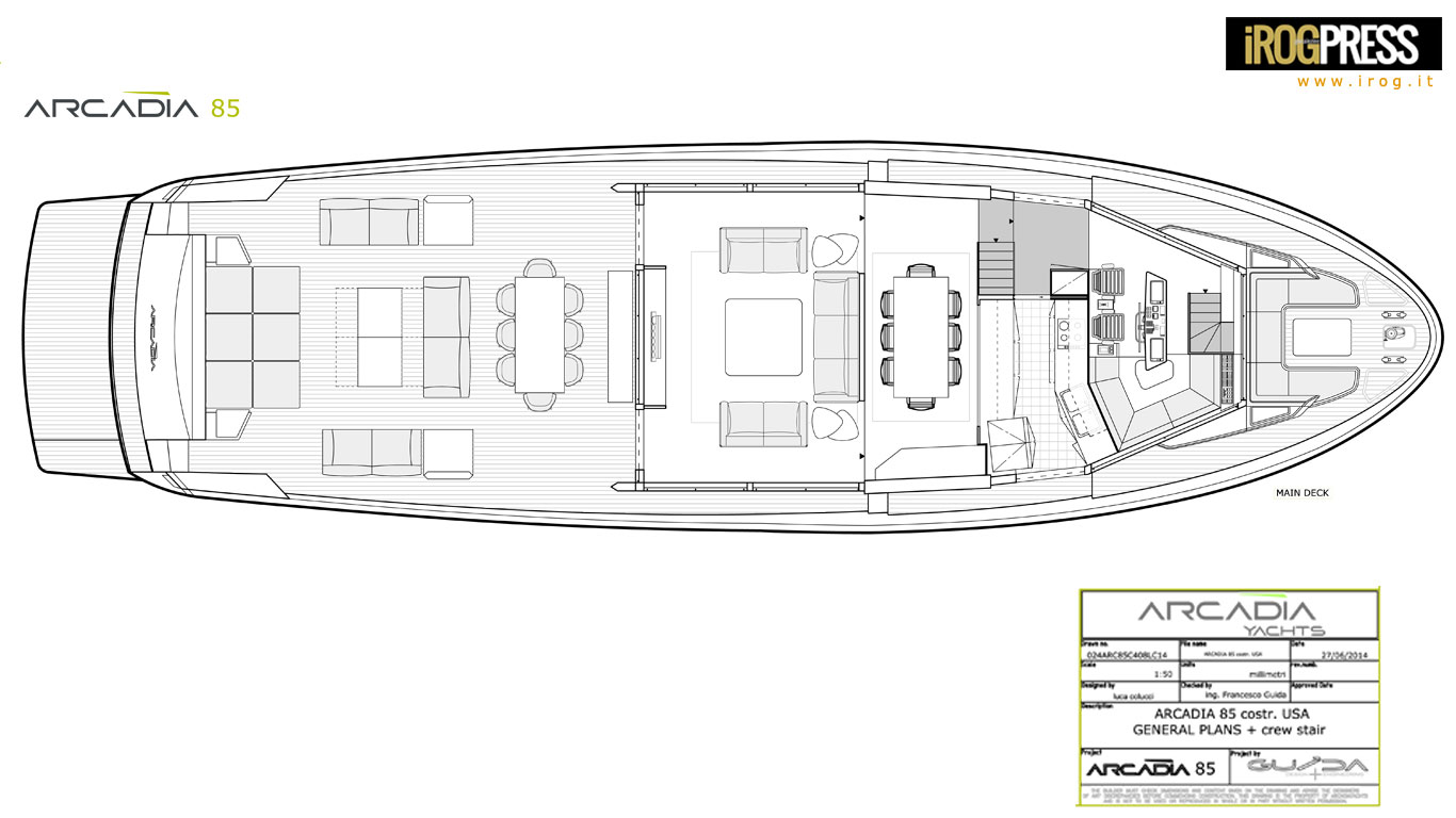 Gli interni dello yacht sono caratterizzati da un arredo moderno realizzato dai più noti e importanti marchi del design Made in Italy, quali Poltrone Frau e Cassina. Quasi tutti gli interni sono composti da pezzi singoli, dando così la possibilità di layout modulabili. In questa versione, l’ARCADIA 85 ha una galley aperta sulla zona pranzo. L’accesso alla wheelhouse è sul lato sinistro.