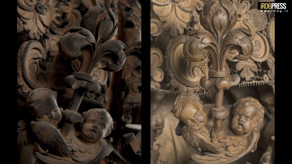 L’attuale restauro (gennaio 2012/marzo 2014), che ha richiesto 1800 ore di lavoro, è stato compiuto da Maria Cristina Gigli e diretto da Laura Speranza, dell’Opificio delle Pietre dure di Firenze. L’intervento ha previsto diverse fasi operative: la complessa pulitura di tutti gli elementi lignei, la revisione completa degli intagli, il consolidamento delle parti bruciate e, infine, la loro qualificazione cromatica. Per attenuare il contrasto fra la discordante tonalità nera e il naturale colore del legno si è deciso di realizzare velature con colori acrilici completate con un tratteggio finale in modo da rendere così riconoscibile l’intervento estetico. L’intervento di restauro, estremamente complesso, ha presentato notevoli innovazioni di carattere tecnico per le particolarità costitutive dell’opera, soprattutto per gli aspetti del consolidamento e del ritocco pittorico.