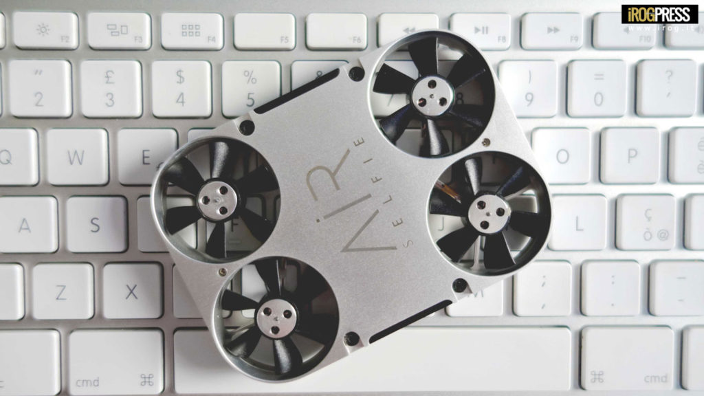 Il device offre all’utente la possibilità di vivere un’esperienza del tutto nuova e inimitabile grazie anche alle sue caratteristiche tecniche. 4 micro motori Brushless (i più piccoli e potenti mai realizzati) e una videocamera da 5mpx sono racchiusi in un elegante e ultra-leggero (61gr) case in alluminio aeronautico anodizzato dal design italiano più piccolo di uno smartphone (6,7×9,4x1cm).