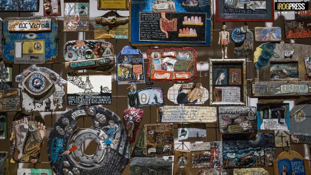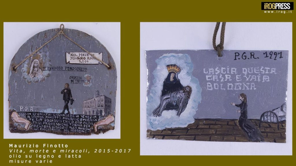 Le singole tavolette, secondo le parole dello stesso Maurizio Finotto realizzate in maniera “mistica e ossessiva”, in gran parte con frammenti di legno recuperati dal mare e lavorate con materiali poveri in diverse tecniche, riprendono iconografie e modalità testuali tipiche delle tradizioni popolari della fede cristiana, disvelando eventi drammatici o imbarazzanti che hanno fortemente condizionato l’esistenza dell’autore. Allestite con la densità espositiva tipica delle usanze tradizionali nei luoghi di culto, le opere narrano per immagini l’infanzia dell’artista, l’abbandono del paese natale nella provincia veneta e di un lavoro sicuro per intraprendere gli studi artistici a Bologna, le alterne fortune di una carriera tortuosa, gli incidenti, gli insuccessi e i traguardi raggiunti nella professione e nella vita privata.