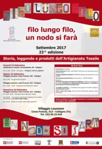L’Associazione Amici della Scuola Leumann organizza, dal 22 al 24 settembre 2017, la 23sima edizione di “Filo lungo filo, un nodo si farà” presso il Villaggio Leumann di Collegno (TO).