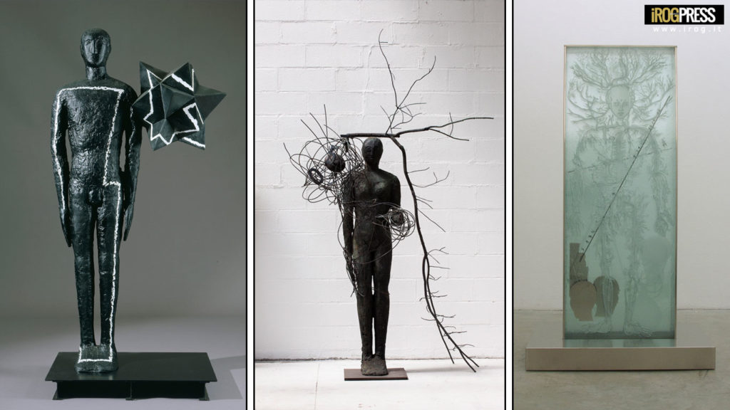 Le opere accompagnano poi sin dentro le sale del museo. A cominciare dalla Sezione Preistoria e Protostoria dove le antichissime ceramiche esposte nelle teche sembrano voler accogliere due esemplari di Dormiente del 2000, in terracotta e ferro, opere che paiono eternare le forme più antiche dei manufatti museali. Poi troviamo diversi esemplari di elmi in terracotta e calce o in ferro e bronzo, materiali che sembrano il riflesso di quelli antichi esposti nel percorso museale.
