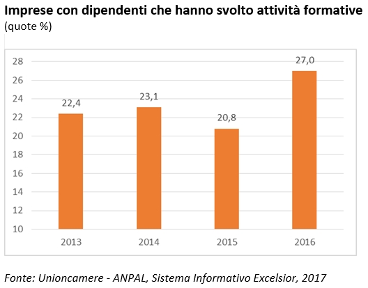 Non stupisce, quindi, che, per gestire il rischio legato alla skills obsolescence, le imprese puntino in misura crescente sulle attività di formazione continua per aggiornare e adeguare le competenze del proprio capitale umano: la quota di imprese che ha svolto tali attività è aumentata nel 2016 in misura significativa rispetto agli anni precedenti, arrivando al 27% del totale.