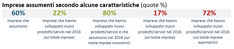 Questa evoluzione che sta interessando il mercato del lavoro risulta ancora più evidente esaminando i programmi di assunzione del 2017, dai quali emerge che il 60% delle imprese prevede nuove entrate – percentuale che sale al 72% per le imprese esportatrici e all’80% quelle che innovano – e oltre un terzo dei contratti sarà destinato a giovani con meno di 30 anni e per oltre il 46% a laureati e diplomati.