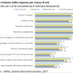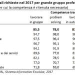 La domanda delle imprese cambia anche con riferimento al cosiddetto skills-mix. I risultati dell’indagine Excelsior 2017 confermano una elevatissima richiesta di competenze trasversali. Fondamentali per la quasi totalità delle figure ad elevata qualificazione (dirigenti, professioni specializzate e tecniche), interessano comunque una quota largamente maggioritaria anche delle figure intermedie, operaie e non qualificate.