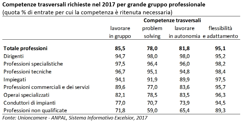 E’ interessante notare come per le professioni altamente qualificate, maggiormente ricercate dal mercato, non vengono richieste solamente competenze tecniche ma anche e soprattutto soft skills a riconoscimento del fatto che la complessità introdotta dalla tecnologia nel nuovo mercato del lavoro richiede principalmente doti quali abilità comunicative, flessibilità, capacità di lavorare in gruppo, capacità di risolvere i problemi.