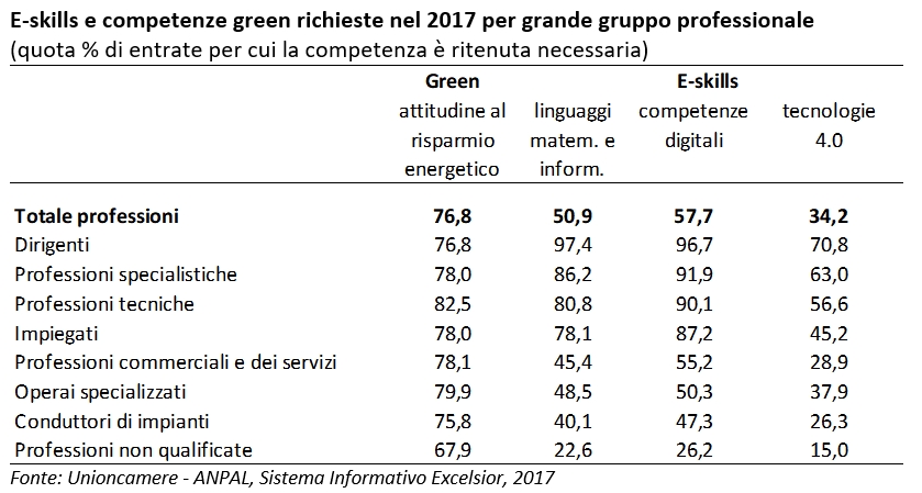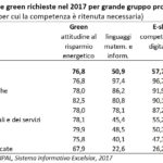 L’indagine mostra inoltre come le difficoltà delle imprese nel reperire i profili desiderati aumentano quando le e-skills (che comprendono la capacità di utilizzare linguaggi e metodi informatici e matematici, il possesso di competenze digitali, la capacità di gestire applicazioni di robotica, big data IoT e dei processi di industria 4.0) sono più rilevanti per lo svolgimento dell’attività lavorativa: quasi il 30% delle figure per le quali le e-skills sono ritenute molto importanti risultano di difficile reperimento. A queste si aggiunge una richiesta molto diffusa e trasversale di competenze “green”, che è possibile definire come l’attitudine al risparmio energetico e alla sostenibilità ambientale.
