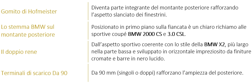 Nella parte superiore della carrozzeria, la spalla ben in vista crea molteplici aree che riflettono la luce e che donano all’abitacolo la leggerezza e la vivacità di una coupé. Tale caratteristica è, inoltre, accentuata dal design slanciato dei finestrini e dalla presenza del marchio sui montanti posteriori, richiamo alle classiche coupé BMW, come la 2000 CS e la 3.0 CSL.