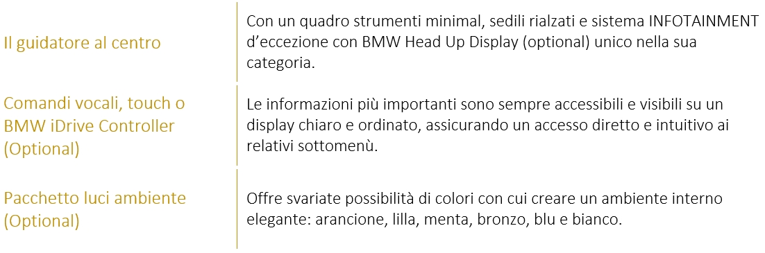 - Ultima versione dell’Infotainment System di BMWgestibile con Comandi vocali, touch o BMWiDrive Controller.