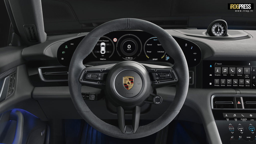 Dotata di due unità sincrone a eccitazione permanente sull’asse anteriore e posteriore – in altre parole, una trazione integrale – e di una trasmissione a due velocità installata sull’asse posteriore, l’architettura del sistema di trazione condivide con gli altri due modelli della gamma i medesimi elementi tecnici salienti. Lo stesso vale per il sistema di gestione intelligente della ricarica e per le caratteristiche aerodinamiche esemplari. Con un cx di 0,22, l’aerodinamica della vettura contribuisce notevolmente a contenere il consumo energetico e quindi a garantire un’autonomia di percorrenza estesa. Tipici della Taycan sono anche il profilo ‘pulito’ d’ispirazione puristica che esprime il DNA stilistico di Porsche e il design esclusivo degli interni dove spicca l’ampia fascia in vetro che ospita gli schermi.