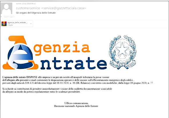 È in corso una nuova campagna di phishing a danno dei cittadini che sfrutta fraudolentemente il logo dell’Agenzia delle Entrate. La mail in questione, inviata dal mittente “Gli organi dell’Agenzia delle Entrate” e firmato da “Ufficio Comunicazioni della Direzione nazionale Agenzia delle Entrate”, chiede di prendere immediatamente visione di un documento allegato contenente disposizioni operative riguardanti le misure sull’efficientamento energetico degli edifici.